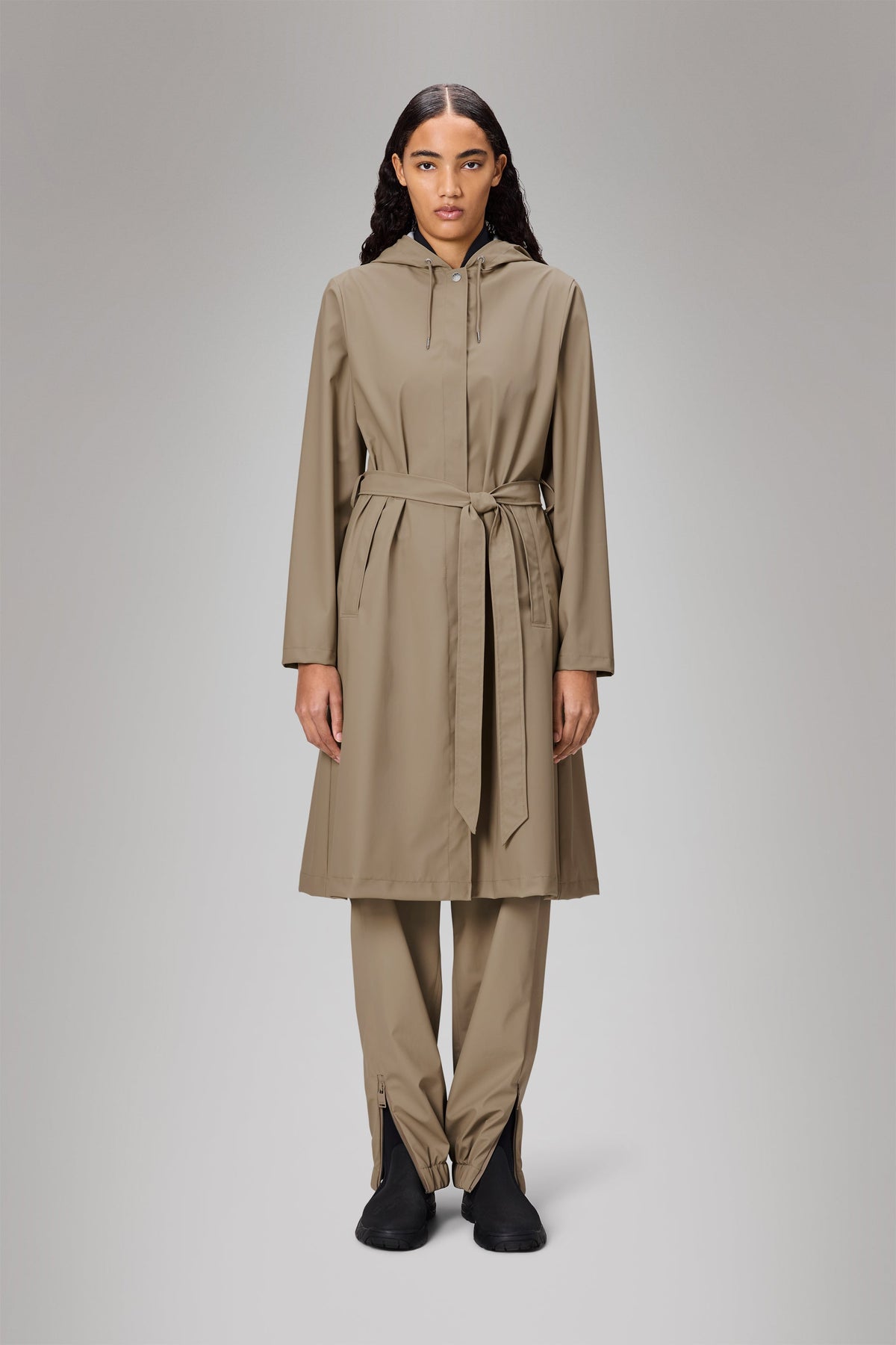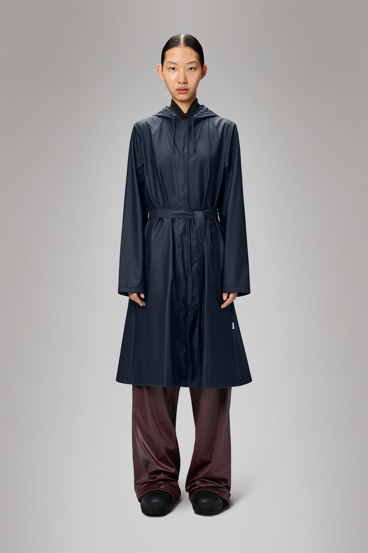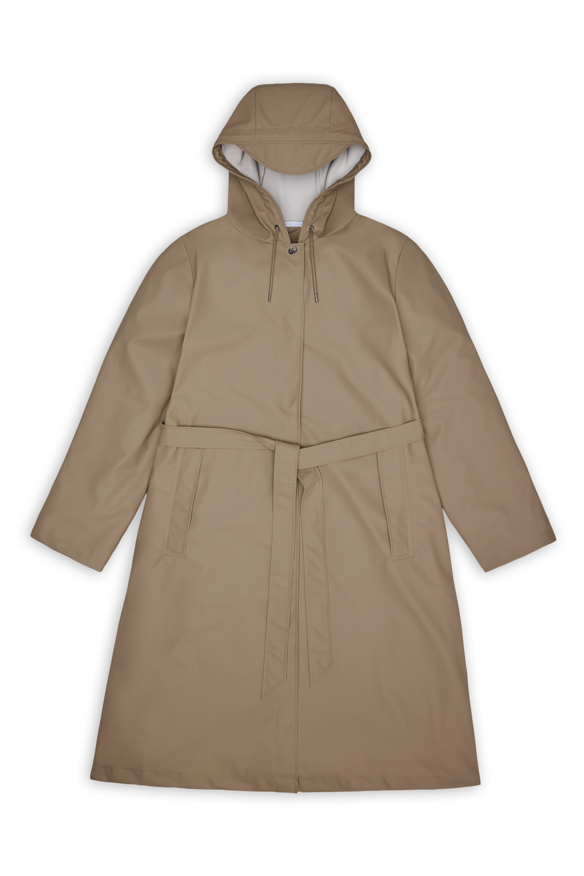 De A-lijn Lange Jas is een stijlvolle regenjas voor dames met een elegant uitlopende A-vorm en een tailleceintuur die het silhouet op een flatterende manier benadrukt.